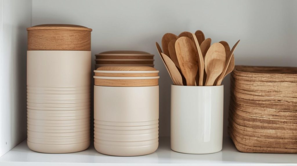 Circular home living concept with natural materials, wood, glass, plants, and reusable containers.