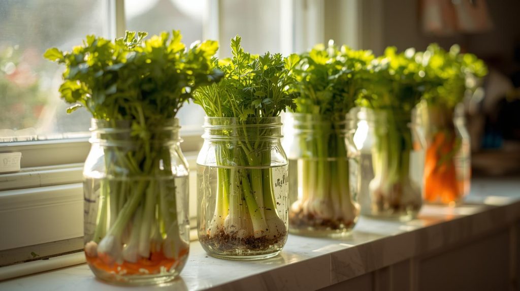• Regrow scallions, basil, celery, mint, lettuce indoors